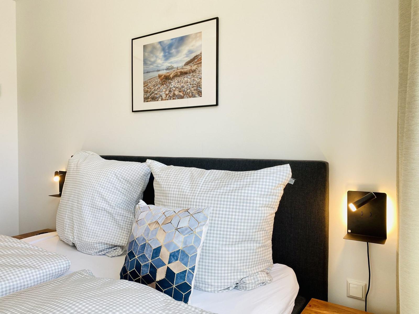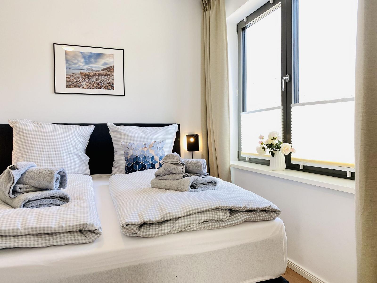 Willkommen in der gemütlichen Ferienwohnung auf Rügen! Diese Wohlfühloase bietet ein Schlafzimmer mit einem großzügigen Doppelbett (180x200 cm) und einem Wohnschlafzimmer mit einer komfortablen Schlafcouch (140x200 cm). Das moderne Badezimmer überzeugt mit einer bodengleichen Dusche und einer angenehmen Handtuchheizung.