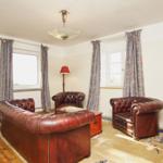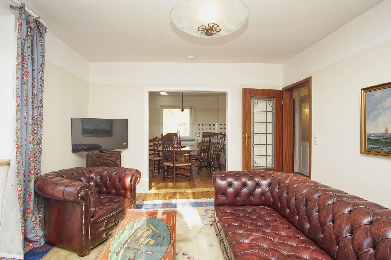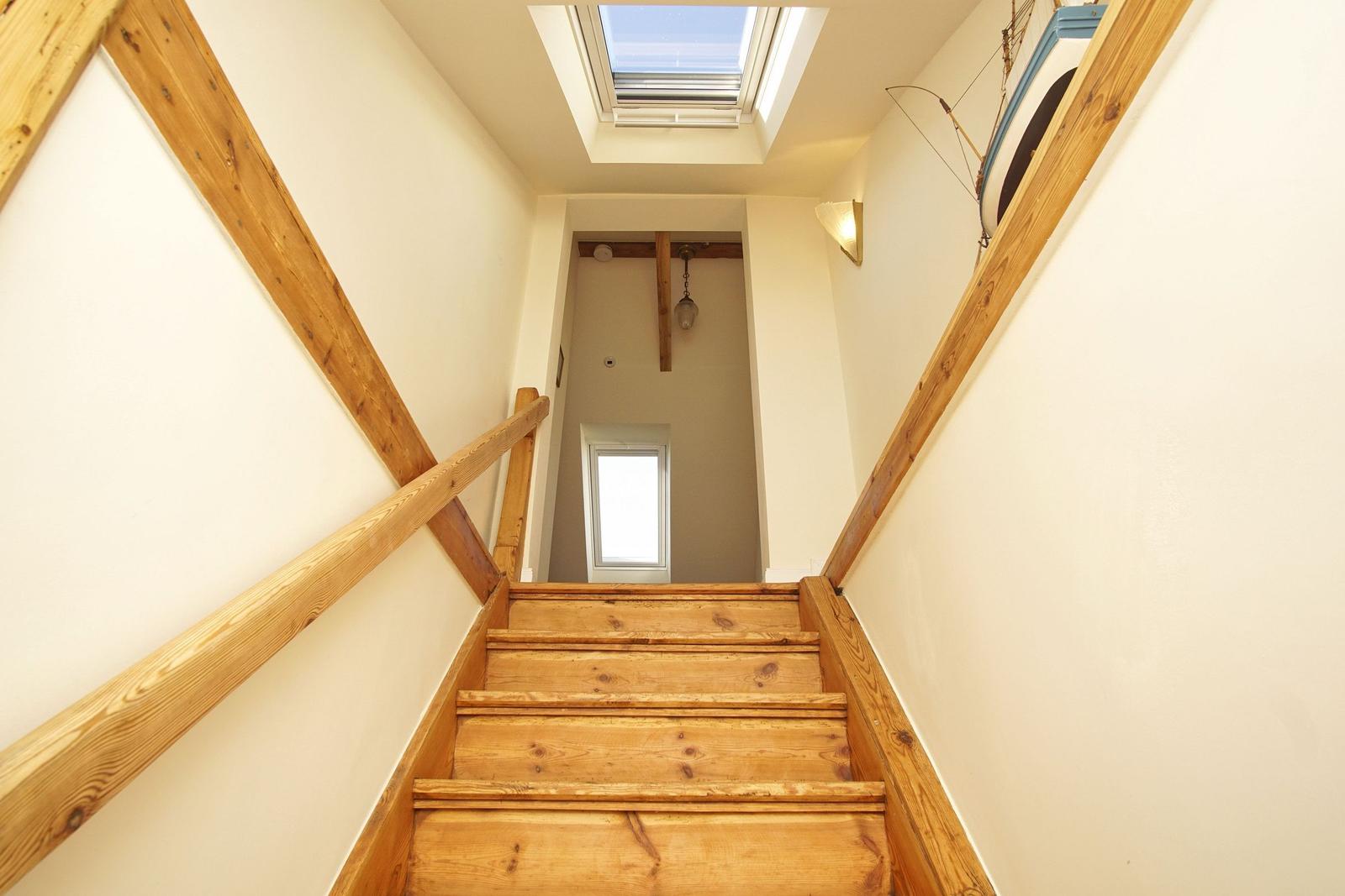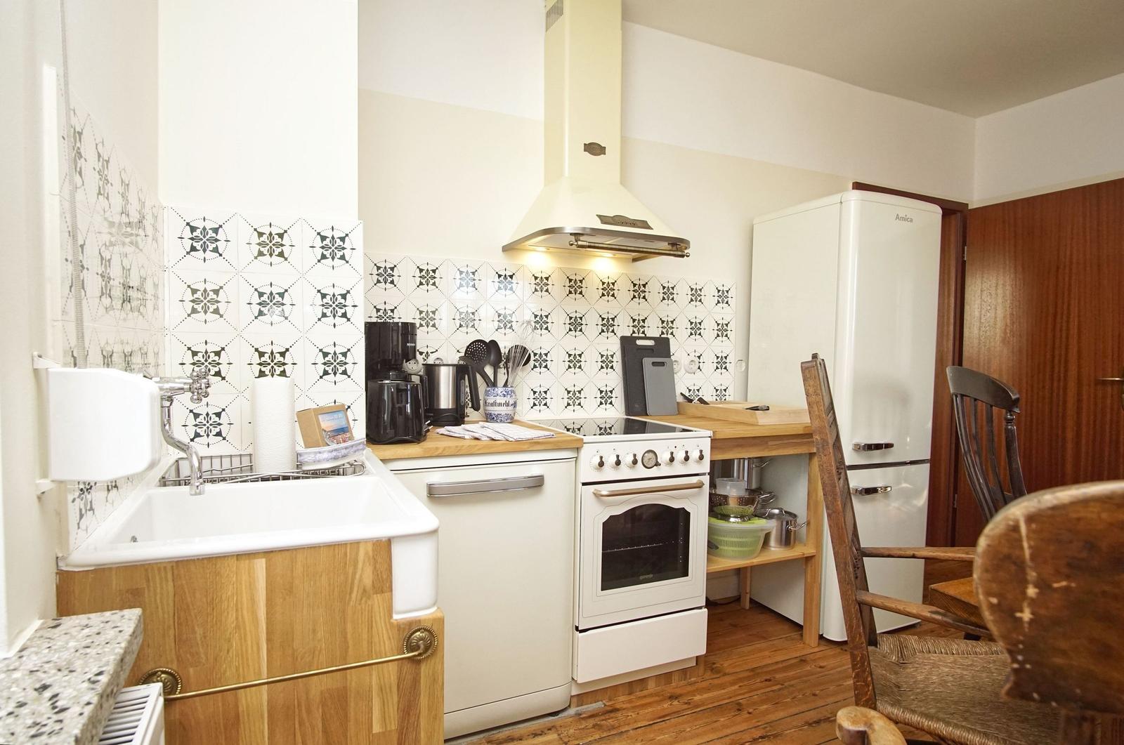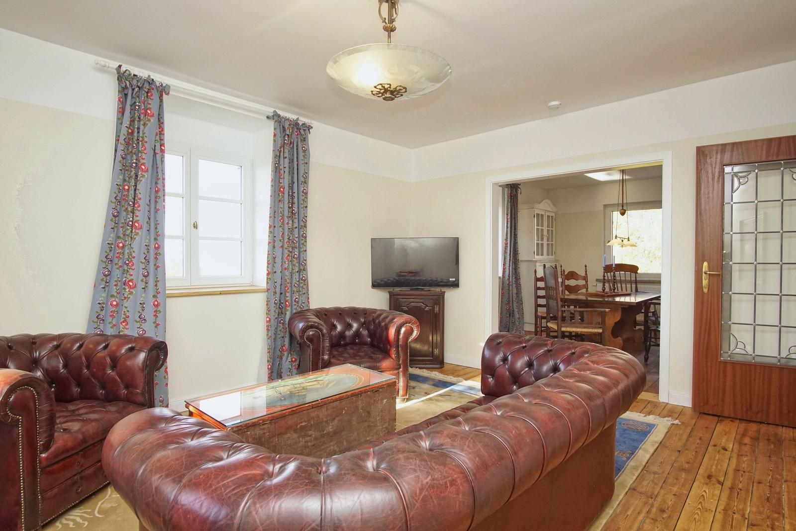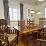 Im Obergeschoss befindet sich das Wohnzimmer mit einer bequemen Ledercouch, einem Ledersessel und einem Flachbild-TV. Die offene Küche verfügt über einen Esstisch, ein Ceranfeld, eine Spülmaschine, einen Kühlschrank mit Gefrierfach, einen Backofen sowie Geschirr und Küchenutensilien.