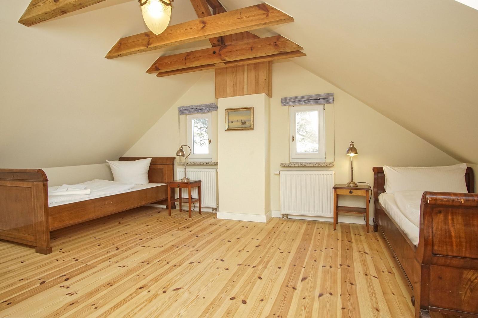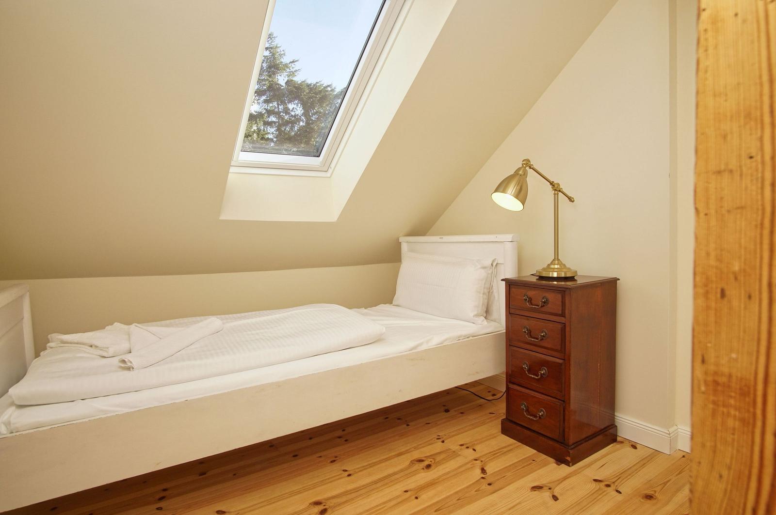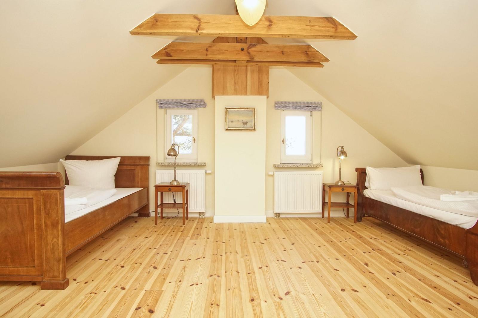Ein Schlafzimmer im Obergeschoss ist mit einem Doppelbett und einem Kleiderschrank ausgestattet, während im Dachgeschoss zwei weitere Schlafzimmer mit jeweils zwei Einzelbetten und Kleiderschrank zu finden sind. Das helle Badezimmer im Obergeschoss ist mit einer Dusche, WC und Waschbecken ausgestattet. WLAN steht kostenfrei zur Verfügung. Ein Parkplatz befindet sich direkt an der Unterkunft.