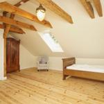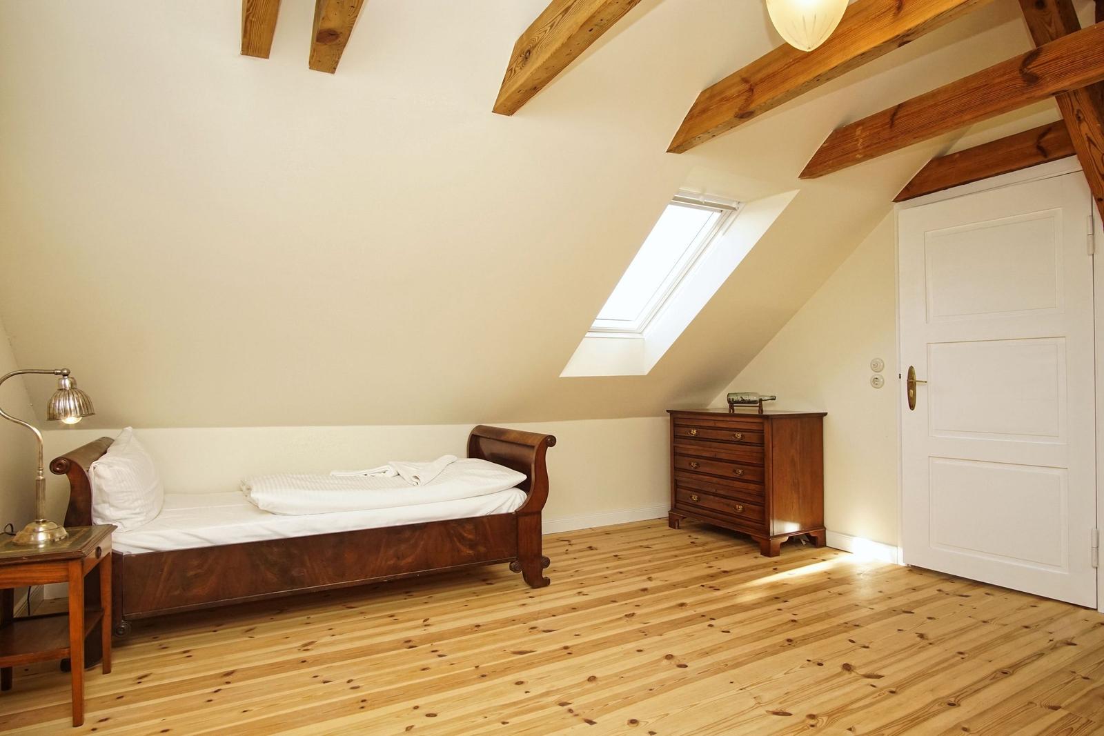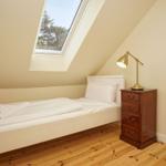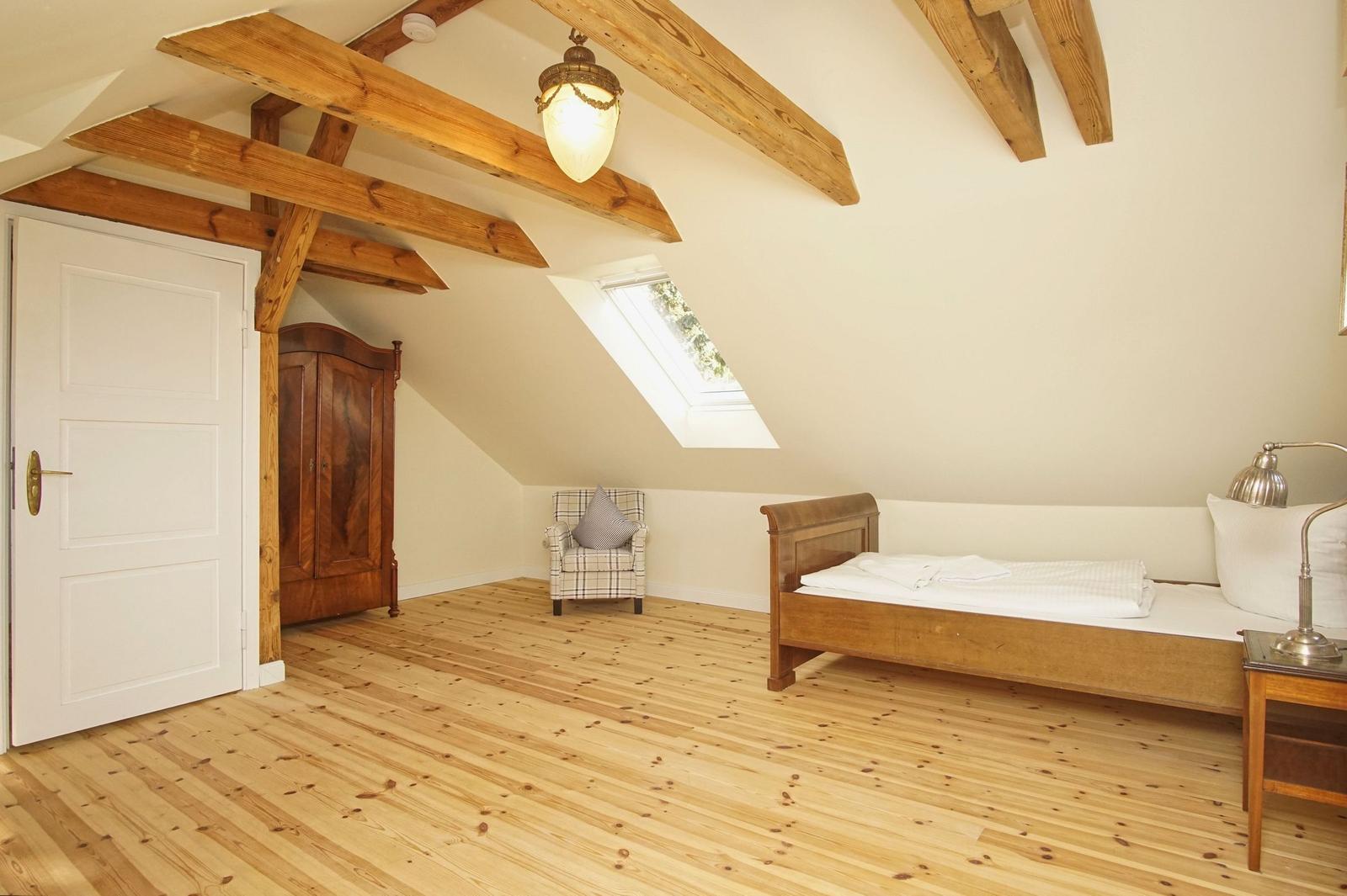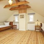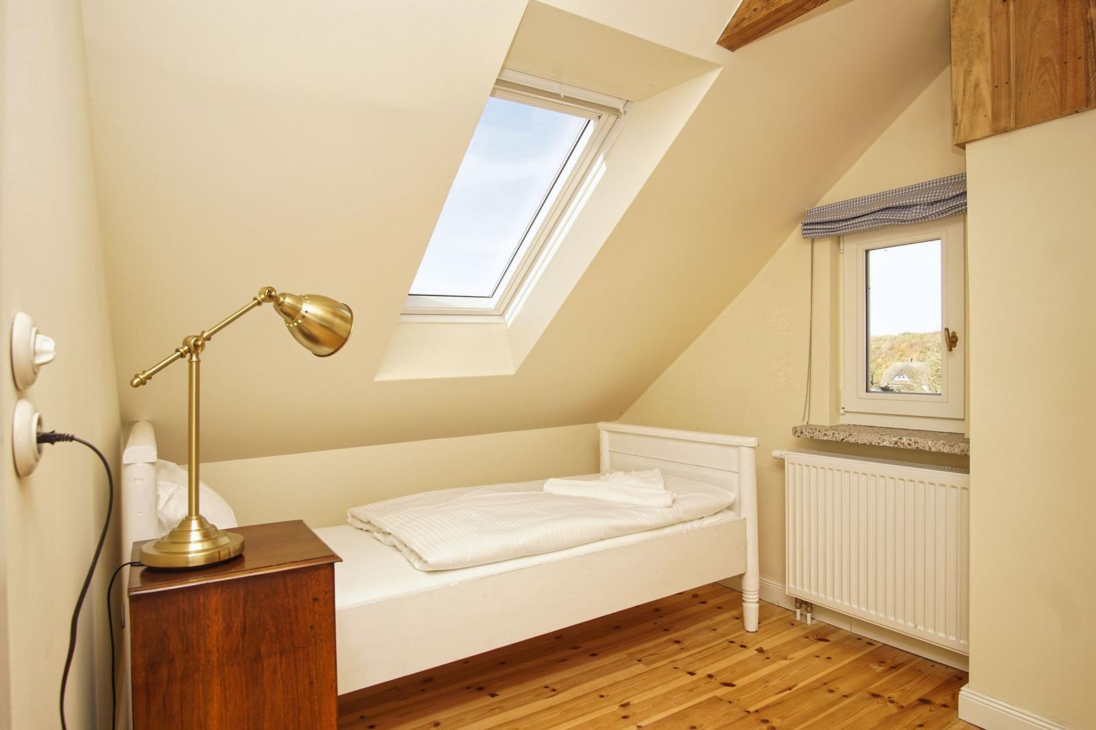 Ein Schlafzimmer im Obergeschoss ist mit einem Doppelbett und einem Kleiderschrank ausgestattet, während im Dachgeschoss zwei weitere Schlafzimmer mit jeweils zwei Einzelbetten und Kleiderschrank zu finden sind. Das helle Badezimmer im Obergeschoss ist mit einer Dusche, WC und Waschbecken ausgestattet. WLAN steht kostenfrei zur Verfügung. Ein Parkplatz befindet sich direkt an der Unterkunft.