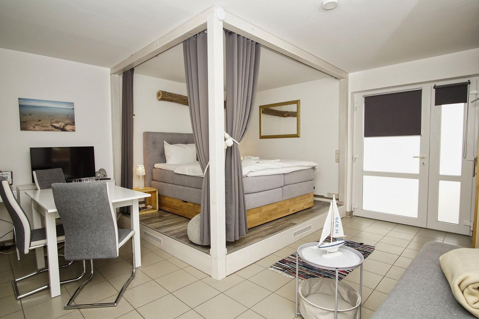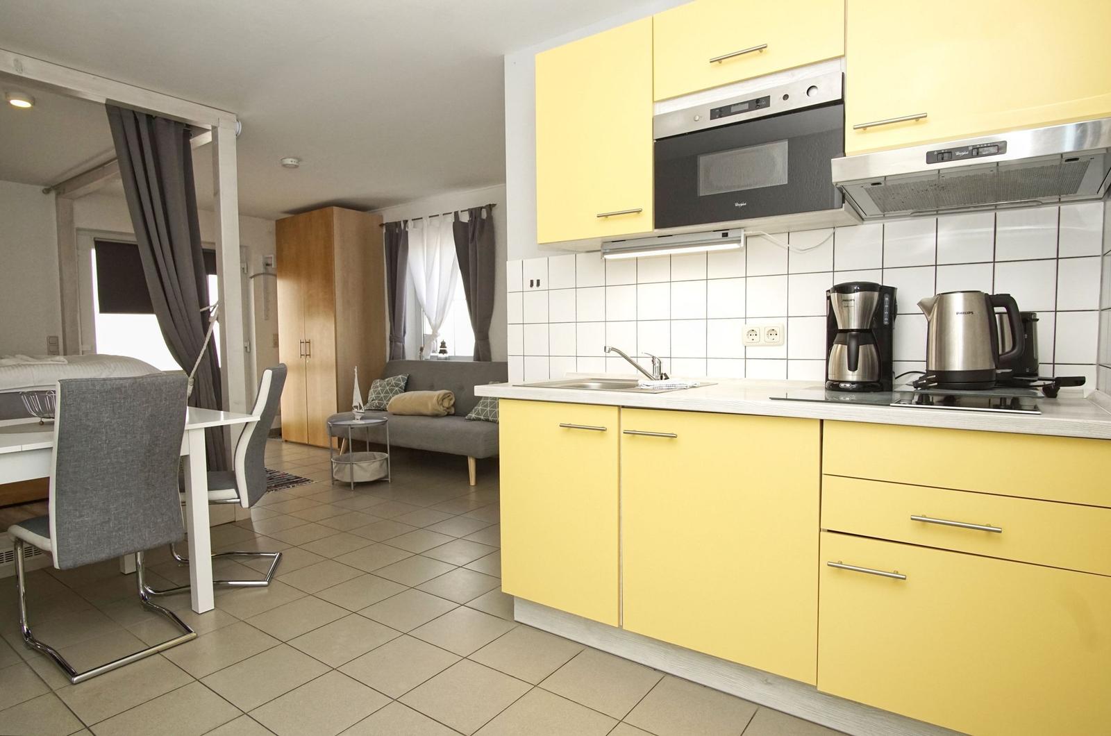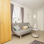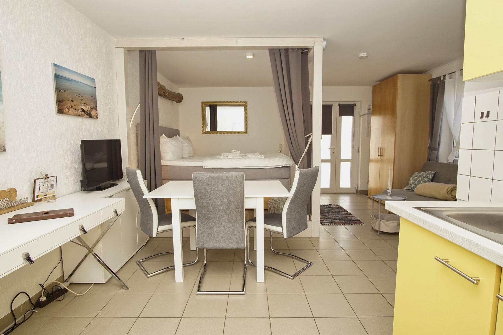 Die 1-Raum-Ferienwohnung Nr. 24 im Haus Windland in Wiek auf Rügen bietet auf 36 m² Platz für bis zu 3 Personen, idealerweise 2 Erwachsene und ein Kind. Die Wohnung ist hundefreundlich und heißt Haustiere willkommen. Der Wohn-Schlafraum ist mit einem bequemen Doppelbett, einer Couch mit Schlaffunktion, einem Flachbildfernseher sowie einem Essbereich ausgestattet. Die offene Pantryküche verfügt über ein 2-Platten Ceranfeld, einen Kühlschrank mit Gefrierfach, und alle erforderlichen Küchenutensilien. Das Bad ist mit Dusche, WC und Fenster ausgestattet. Ein eingezäunter kleiner Garten steht individuell zur Verfügung. Für weitere Erledigungen sind eine Münz-Waschmaschine und ein Trockner in einem gemeinschaftlichen Hauswirtschaftsraum vorhanden. WLAN ist kostenfrei, ein Parkplatz befindet sich direkt am Haus.