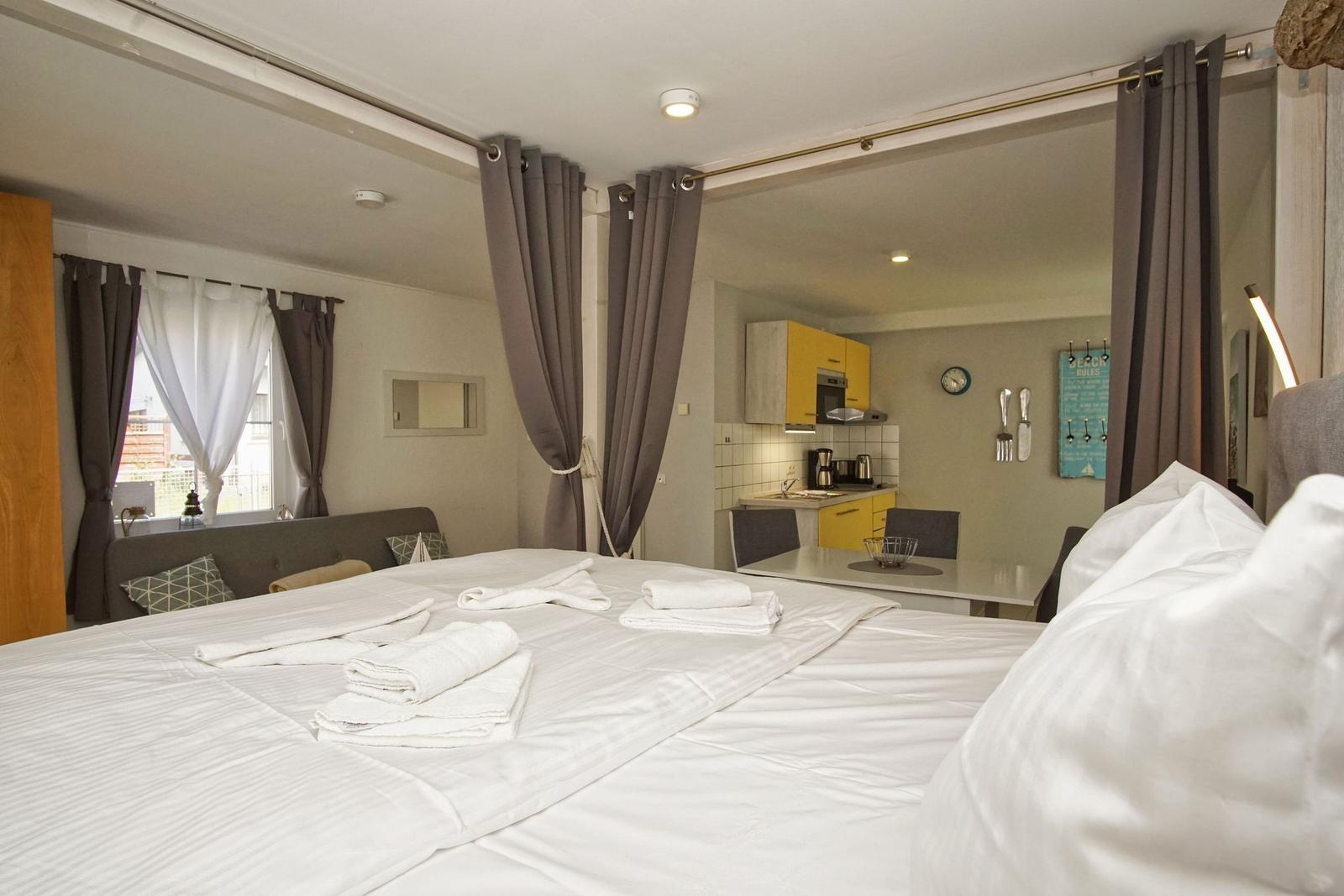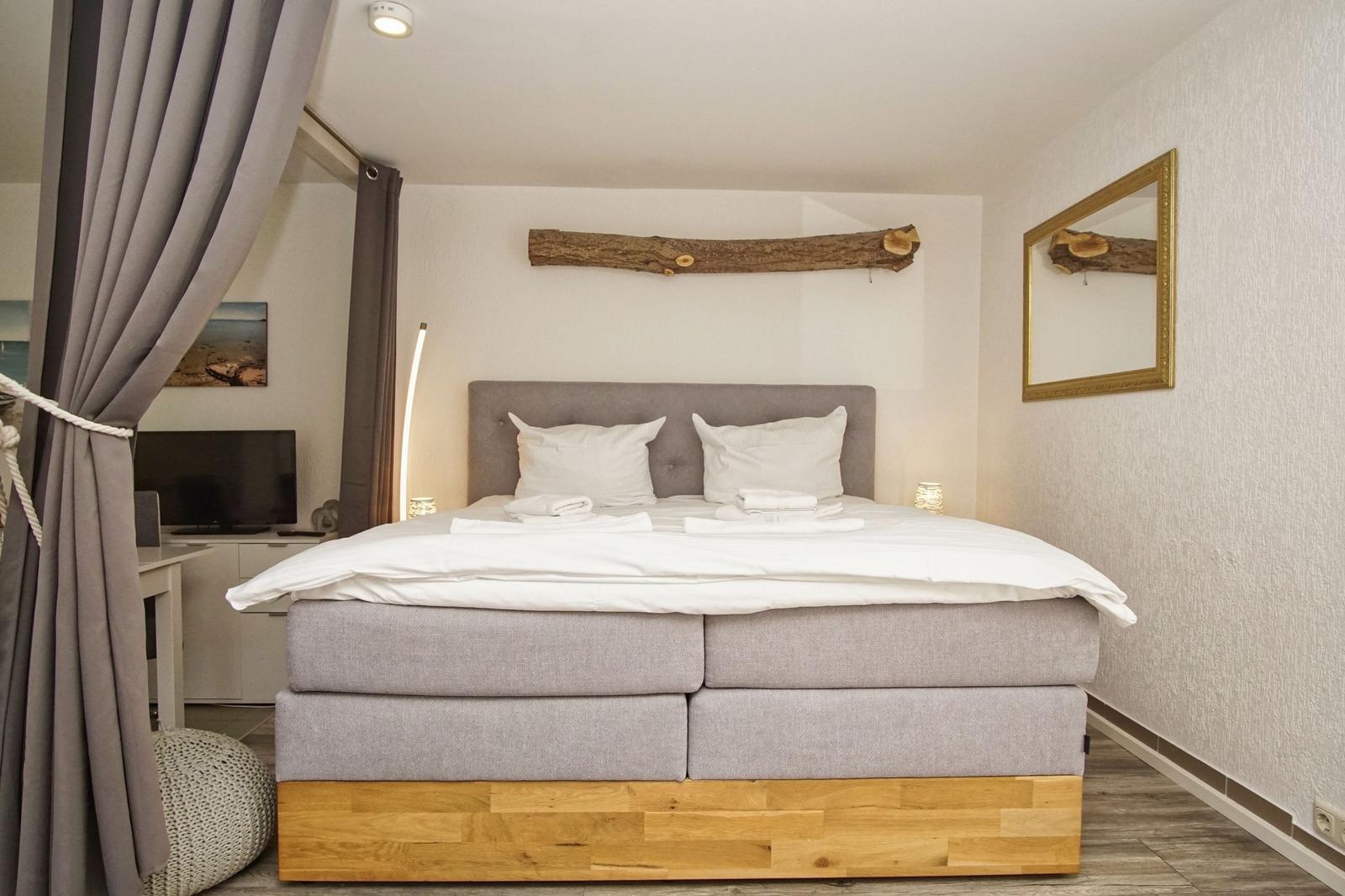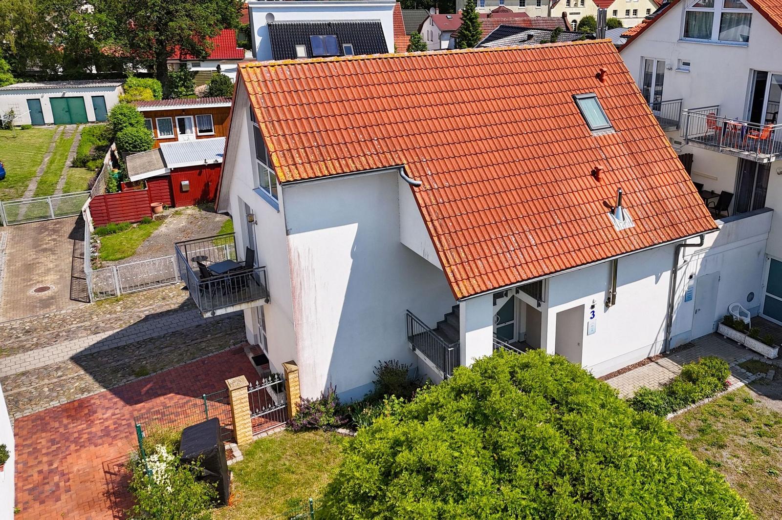 Die 1-Raum-Ferienwohnung Nr. 24 im Haus Windland in Wiek auf Rügen bietet auf 36 m² Platz für bis zu 3 Personen, idealerweise 2 Erwachsene und ein Kind. Die Wohnung ist hundefreundlich und heißt Haustiere willkommen. Der Wohn-Schlafraum ist mit einem bequemen Doppelbett, einer Couch mit Schlaffunktion, einem Flachbildfernseher sowie einem Essbereich ausgestattet. Die offene Pantryküche verfügt über ein 2-Platten Ceranfeld, einen Kühlschrank mit Gefrierfach, und alle erforderlichen Küchenutensilien. Das Bad ist mit Dusche, WC und Fenster ausgestattet. Ein eingezäunter kleiner Garten steht individuell zur Verfügung. Für weitere Erledigungen sind eine Münz-Waschmaschine und ein Trockner in einem gemeinschaftlichen Hauswirtschaftsraum vorhanden. WLAN ist kostenfrei, ein Parkplatz befindet sich direkt am Haus.