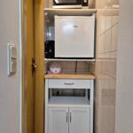 Küchenecke mit Kühlschrank, Kaffeemaschine, Eierkocher, Mikrowelle, Geschirr
